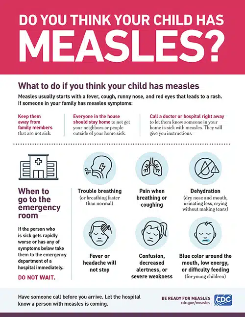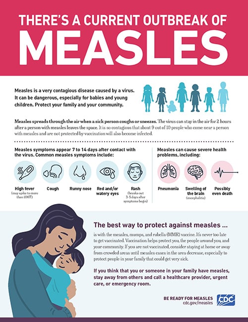 These helpful informational flyers from the CDC will help you to educate yourself, recognize the symptoms, and what to do if you suspect a family member has contracted Measles.